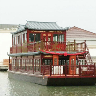 畫舫船就是裝飾古典華麗的游船,是"中國風"的仿古游船,結合古典園林建筑,體現了中華文明的古典藝術.畫舫船豪華而又古典,船上的建筑按照中國古代建筑里的亭臺樓閣,建筑工藝之復雜,要求之嚴格,仿古畫舫游船的特點飛檐翹角、玲瓏精致的四角亭子逐漸成形,赫然立于船頭,美人靠、盤龍柱子、彩畫……龍柱上的浮雕盤龍和祥云一層扣著一層,層層錯落有致,雕刻精細到盤龍身上的每一個鱗片都細細可數,古代皇家標志性元素,在畫舫船上體現的淋漓盡致。除了雕刻、花窗,整條船還有一個看點,那就是弧線優美、高高翹起的船尾。游船并不大,長約10米、寬3米,但是整體看起來堪稱一件藝術品。船尾的雕花欄桿與船艙、船頭的雕刻遙相呼應,船身四周貼著浮雕祥云,給整條船增添了富貴、華麗的氣質。